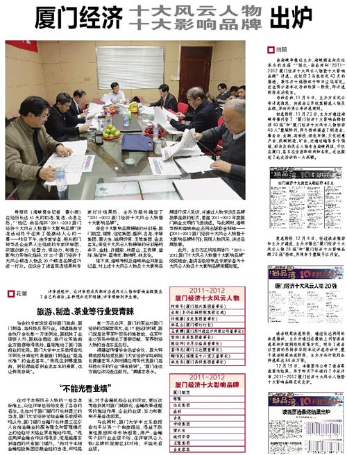 12月20日被業(yè)界稱為閩南經(jīng)濟(jì)領(lǐng)域“奧斯卡”獎(jiǎng)的“2011-2012廈門經(jīng)濟(jì)十大風(fēng)云人物”評選結(jié)果揭曉,三達(dá)膜環(huán)境技術(shù)股份有限公司董事長兼總經(jīng)理藍(lán)偉光博士等十位商業(yè)精英成功當(dāng)選。本次評選由海峽導(dǎo)報(bào)、海峽商業(yè)、臺灣海峽競爭力論壇主辦,已成功舉辦三屆,評選邀請了廈門的權(quán)威經(jīng)濟(jì)學(xué)家、行業(yè)協(xié)會資深人士、媒體傳播界專業(yè)人士及社會知名人士組成評審委員會,通過影響力、創(chuàng)新力、經(jīng)營力、和諧力和帶動(dòng)力等五個(gè)細(xì)化指標(biāo)進(jìn)行考核,歷時(shí)43天、主辦方收到的報(bào)紙和網(wǎng)絡(luò)的總決選票達(dá)到618,653張。